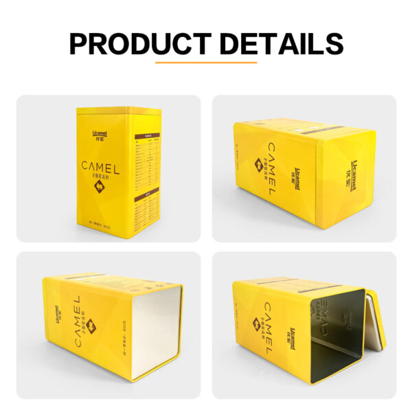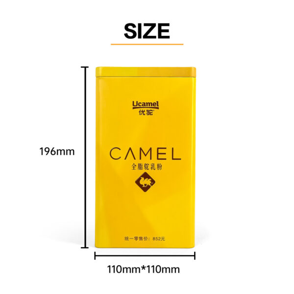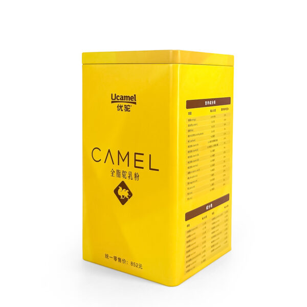 The front displays the brand name (Ucamel) and the product name “CAMEL Full Cream Camel Milk Powder”, paired with a camel silhouette logo—simple, bold, and highly recognizable.